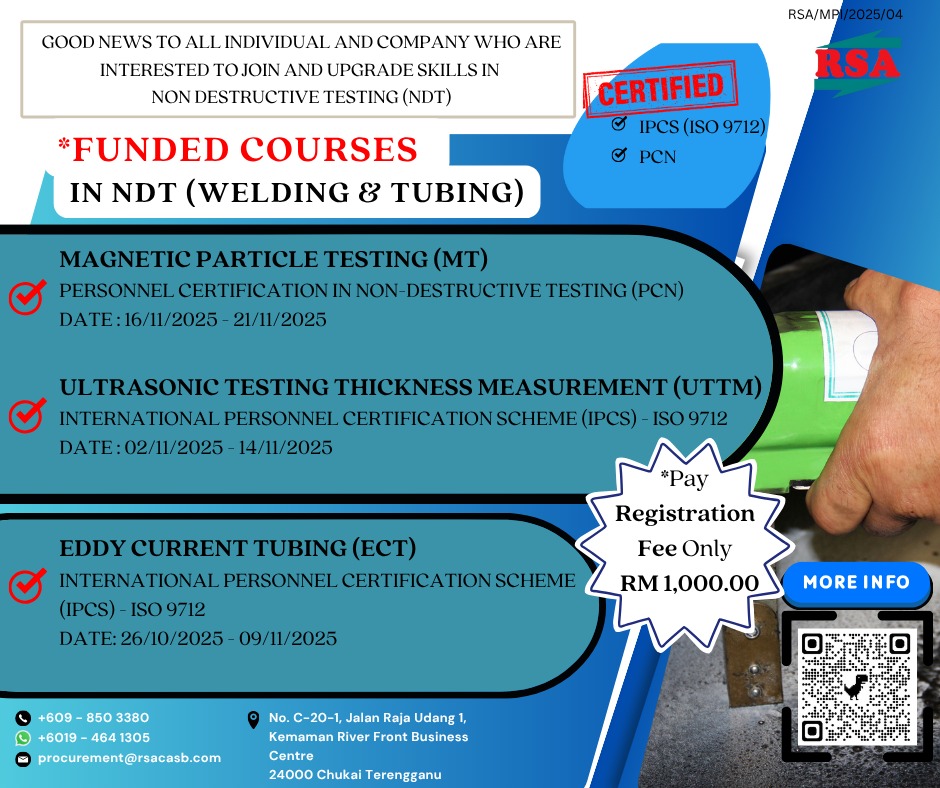 RSA Academy Sdn Bhd has been one of leading provider for training in non-destructive testing for more than 10 years. Training was provided either for personal interest or company request.